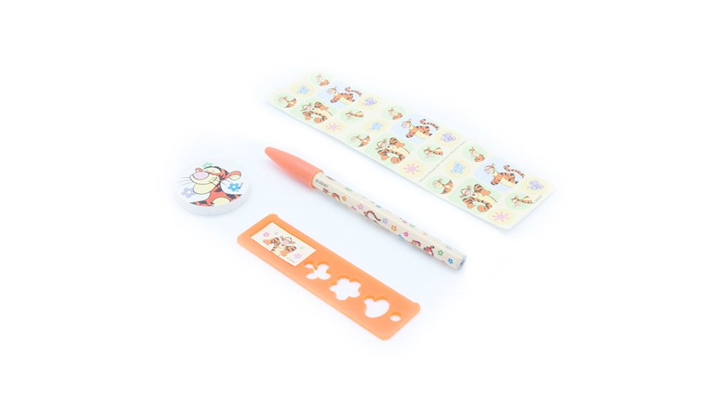 Blyant, viskelæder, lineal og klistremærker