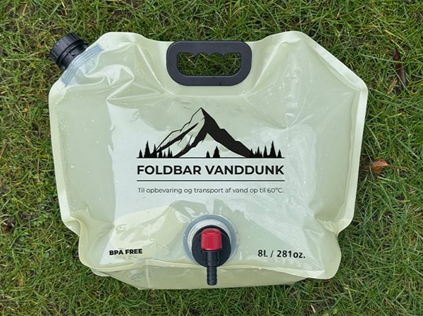 Praktisk foldbar vanddunk, der kan indeholde op til 8 liter, som gør det nemt at opbevare og transportere vand, på f.eks. camping, vandreture eller i båden.