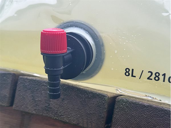 Med skruelåg og tappehane for nem opfyldning og dosering. Drej blot på det røde låg på tappehanen for at åbne og lukke.