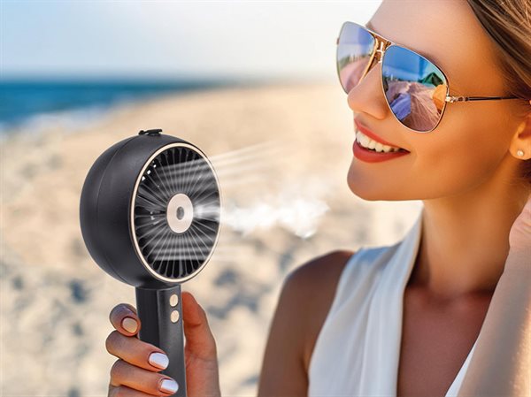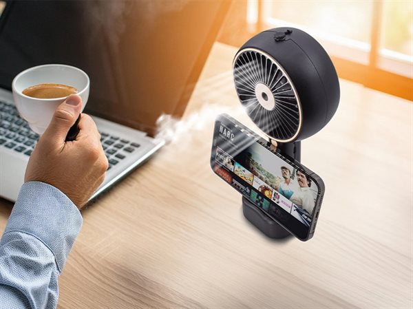 Ha’ altid en frisk brise med dig! Fresh Breeze med indbygget forstøver opfrisker dig øjeblikkeligt, uanset hvor du er. Dens base med smartphoneholder giver dig også mulighed for at se dine yndlingsfilm, mens du slapper af i den kølige vind. Genopladelig med USB-kabel.