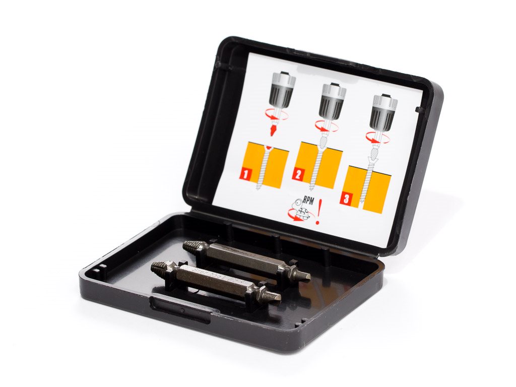 Skrueudtrækkeren fjerner let alle typer skruer med ødelagt kærv. Den ene ende fræser "et nyt gevind" ind i den ødelagte skrue. Den anden ende trækker skruen ud. Et sæt består af to forskellige størrelser Skrueudtrækkere i en praktisk æske.