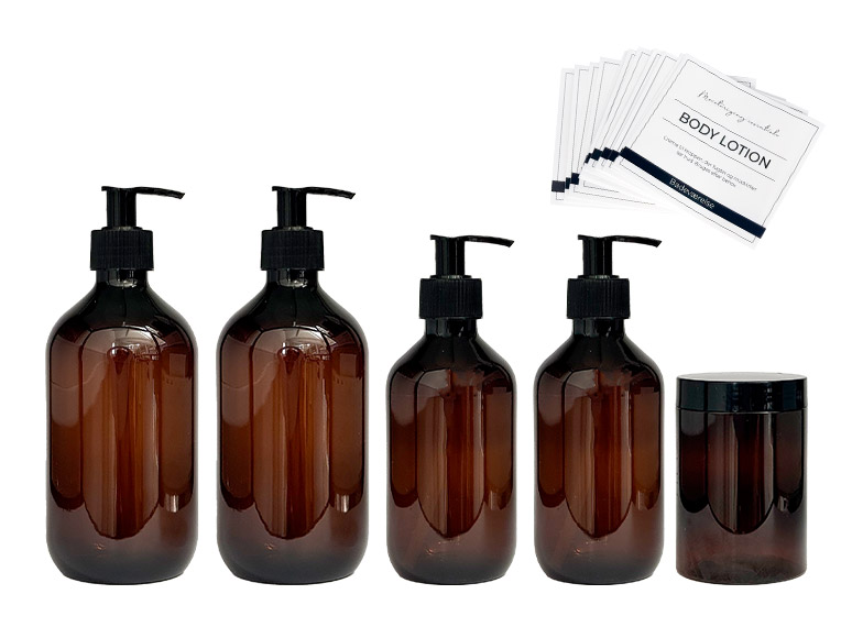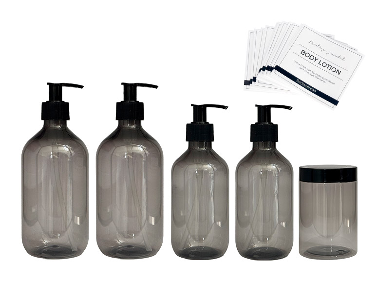 Sættet indeholder 4 sæbeflasker med pumpe, 1 krukke og 14 fortrykte labels med de mest basale produkter, man bruger på badeværelset og i køkkenet.